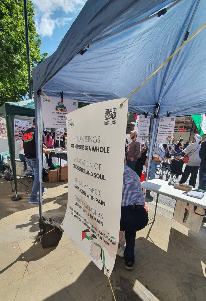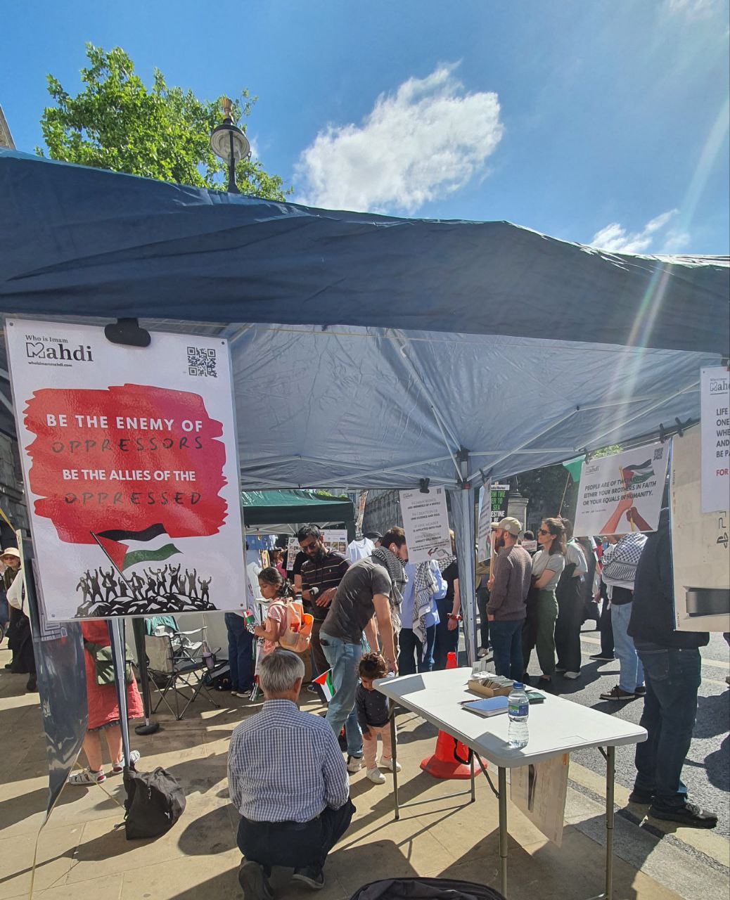 إلى جانب كونها العاصمة، تتحمل لندن لقب أكبر وأكثر المدن كثافة في بريطانيا، ونحن أقيمنا جناح حملة “Who is Imam Mahdi” في قلب هذه المدينة. في نفس اليوم، كان جمع كبير من سكان لندن يتجمعون في مسيرة مناهضة للصهيونية. شكل جناحنا، المزدان بالصور والقصص حول الإبادة الجماعية في فلسطين، تماشى مع هذه المسيرة الضخمة والوعي بمظلومية سكان غزة، ما جذب عددًا لا بأس به من الزوار إلى جناحنا.