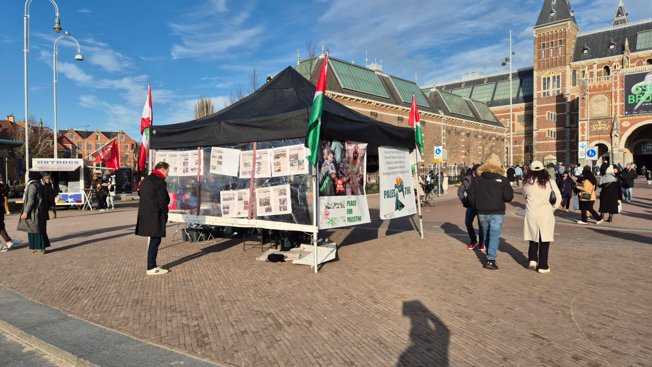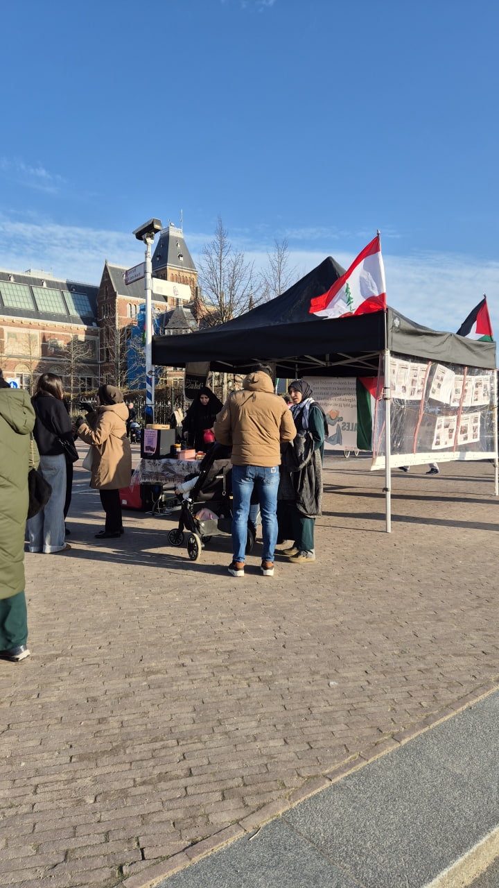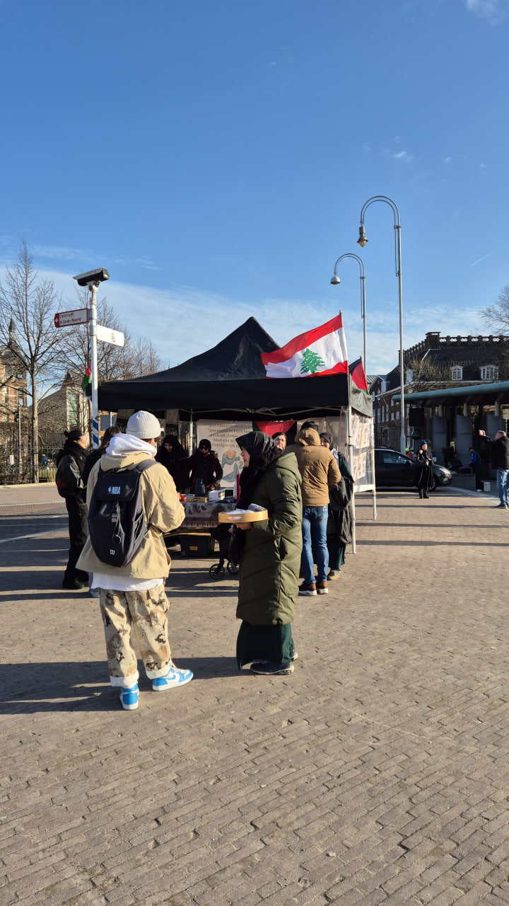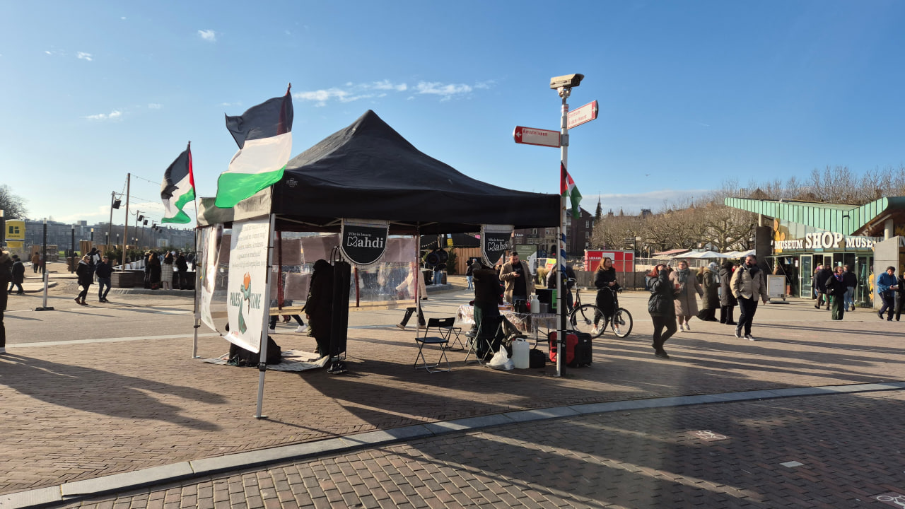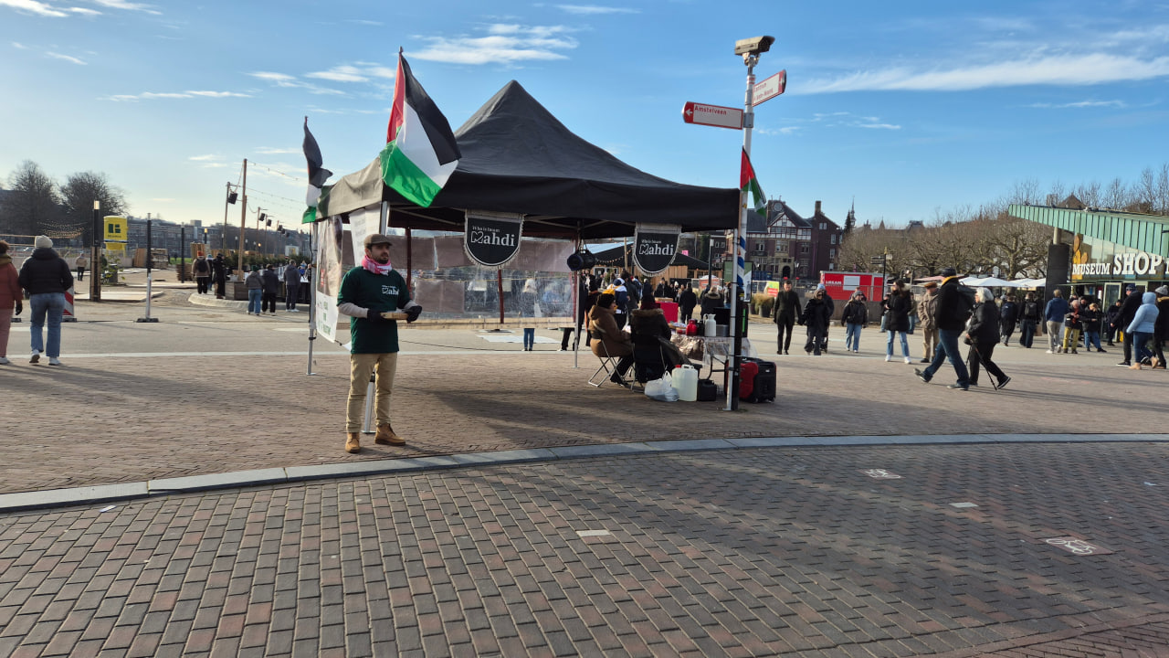 كان أهل هولندا — وإن كانوا غير منتظمين في التجمع — يعقدون مسيرات دعم متكررة لفلسطين، وكل مرة يزداد حضورهم عن السابقة. وفي اليوم الذي نصبنا فيه جناح حملةِ الإمام المهدي تصادف ذلك مع إحدى تلك المسيرات. كان المارة على طول المسيرة يجرون معنا أحاديث ودّية. وكان طيف الجمهور واسعًا، لا سيما الشباب الذين هم أكثر يقظة للقضية الفلسطينية والمهتمون بإنتاجات الحملة.